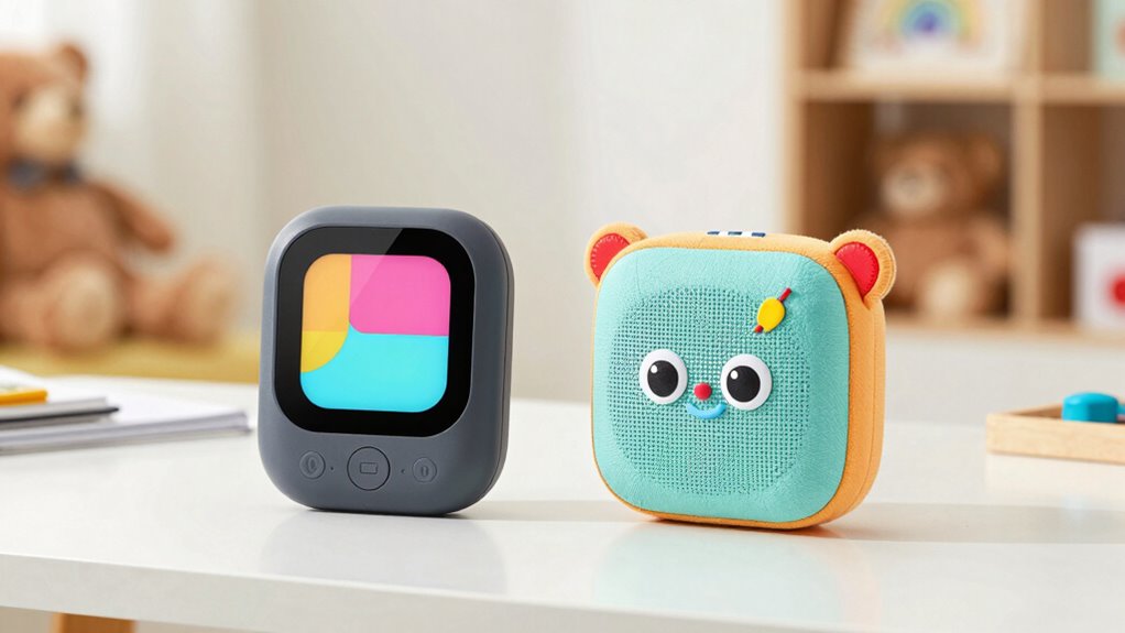 Comparing the price and overall value of the Yoto Player and Toniebox requires looking beyond just the initial cost. The Yoto Player generally offers a larger library of over 1,000 cards, giving more content options for the price. It also includes features like nightlights, thermometers, and customizable content, which add to its value. On the other hand, the Toniebox’s starter sets often come with one figure and basic features, but adding more figures and content over time can increase expenses. While Toniebox’s interactive figures boost engagement, they also add to the total cost. When evaluating value, consider both the upfront device price and the expenses of expanding content, as these factors considerably influence long-term satisfaction and affordability.